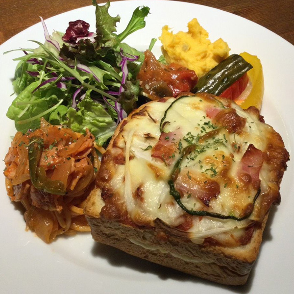 パンの間には濃厚なベシャメルソースを挟みクロックムッシュ風ピザトーストにしました。副菜やナポリタンスパゲッティも付き満足プレートです。